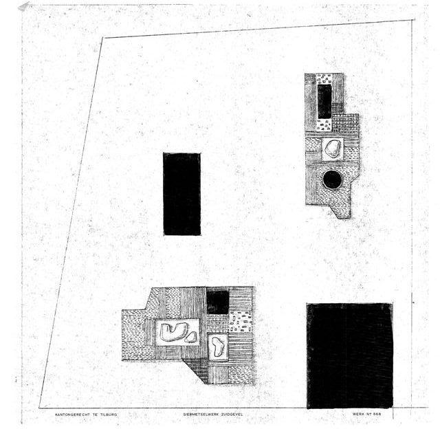 Aan de achterzijde maakt de muschelkalk gevelbekleding plaatst voor een baksteenreliëf van Luc van Hoek. De justicia-weegschaal op de westgevel is gemaakt naar een ontwerp van Bedaux zelf.