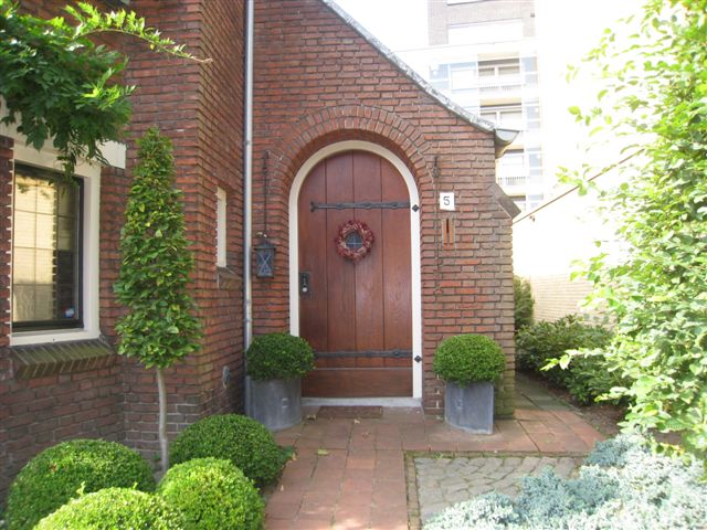 Het dak boven de ingang van dit huis vertoont veel overeenkomsten met de dakjes boven de wegkruisen die Bedaux voor het Brabants Studentengilde in deze tijd ontwierp.