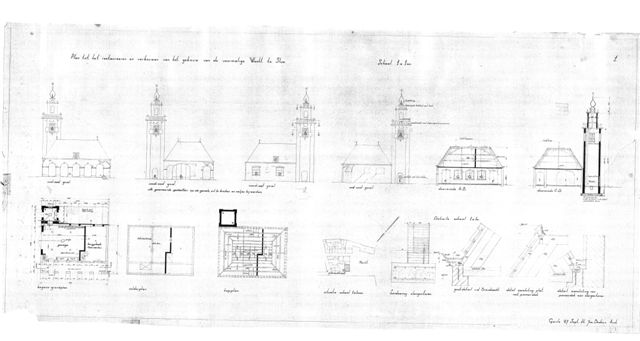Door het oorlogsgeweld waren van de brandwacht alleen de muren en verschillende bogen overeind gebleven. Bedaux heeft er een nieuwe toren tegenaan gezet in zijn eigen idioom met een Kempisch ui er bovenop.